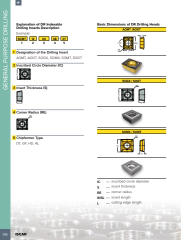 106 ISCAR GENERAL PURPOSE DRILLINGExplanation of DR Indexable Drilling Inserts Description Example:SOMT 12 04 08 - DT1 2 3 4 51 Designation of the Drilling InsertAOMT, AOGT, SOGX, SOMX, SOMT, SOGT2 Inscribed Circle Diameter (IC) IC3 Insert Thickness (S) S4 Corner Radius (RE) RE5 Chipformer TypeDT, GF, HD, ALBasic Dimensions of DR Drilling HeadsAOMT /AOGTRESINSLL178%u00b0SOGX / SOGTICRESSOMX / SOMTSICREIC %u2014 inscribed circle diameterS %u2014 insert thicknessRE %u2014 corner radiusINSL %u2014 insert lengthL %u2014 cutting edge length