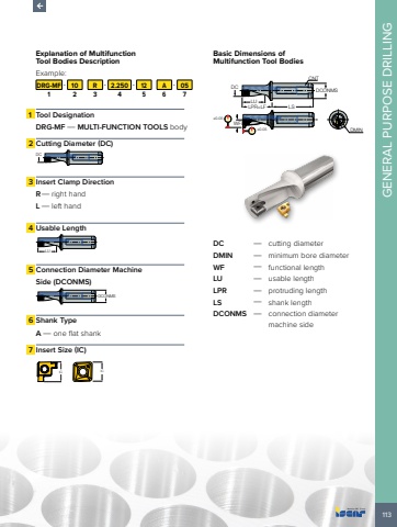 113GENERAL PURPOSE DRILLINGExplanation of Multifunction Tool Bodies Description Example:DRG-MF - 10 R - 2.250 - 12 A - 051 2 3 4 5 6 71 Tool DesignationDRG-MF %u2014 MULTI-FUNCTION TOOLS body2 Cutting Diameter (DC) DC3 Insert Clamp DirectionR%u2014 right handL %u2014 left hand4 Usable Length LU5 Connection Diameter Machine Side (DCONMS) DCONMS6 Shank TypeA %u2014 one flat shank7 Insert Size (IC)IC ICBasic Dimensions of Multifunction Tool BodiesDCWFLPR=LFLULSDCONMSDMINCNT%u00b10.05%u00b10.05DC %u2014 cutting diameterDMIN %u2014 minimum bore diameterWF %u2014 functional lengthLU %u2014 usable lengthLPR %u2014 protruding lengthLS %u2014 shank lengthDCONMS %u2014 connection diameter machine side