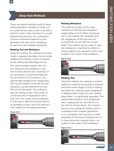 215DEEP HOLE DRILLING%u00bd%u0009Deep Hole MethodsThere are several methods used for deep drilling operations. Rotational motion can be produced by a part or tool, or by both a part and a tool. Linear movement is usually performed by the tool. The combination of these movements depends on the geometry and sizes of the workpiece, as well as on the available equipment.Rotating Tool and WorkpieceUsing this method, the workpiece and tool rotate in opposite directions; the tool while rotating also performs a linear movement for the drilling operation (Figure 6.3.1). The recommended rotation ratio of a tool relative to the workpiece is 3-5:1, which means that for each revolution of the workpiece it is recommended that the tool perform 3-5 revolutions. The approximate deviation from straightness with counter-rotation of the drill and the workpiece can be 0.005-0.03 mm per 100 mm of hole depth. This method is great for drilling a hole in the center of cylindrical parts. If requested to drill a hole not in the center of the workpiece, or if the part is difficult to revolve due to its geometry or sizes, then this method is less suitable for the drilling operation.Figure 6.3.1 Rotating WorkpieceThis method is based on the linear movement of the tool and workpiece rotation (Figure 6.3.2). When machining with a non-rotating tool, deviation from the straightness of the hole axis can be 0.03-0.06 mm per 100 mm of hole depth. This method can be useful in case the workpiece is machined on lathes or turning stations and required to drill a hole located in the center of the workpiece.Figure 6.3.2Rotating ToolUsing this method, the workpiece remains stationary while the tool performs rotational and linear motion (Figure 6.3.3). A rotating tool allows for relatively good straightness in drilling shallow holes, but when drilling deep holes, it is significantly degraded. The approximate deviation from straightness with a rotating drill can be 0.06-0.1 mm per 100 mm of hole depth. This method may be most suitable for drilling holes in a workpiece with complex geometries or in a workpiece with big sizes or when requested to drill several parallel holes or in cases where the required hole is not located in the center of the workpiece.Figure 6.3.3