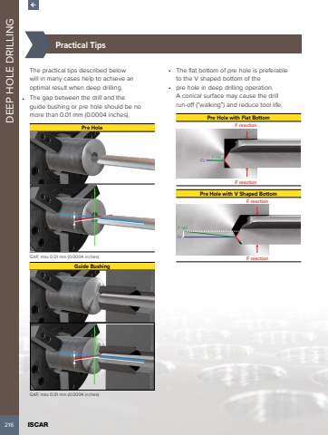 216 ISCAR DEEP HOLE DRILLING %u00bd%u0009Practical TipsThe practical tips described below will in many cases help to achieve an optimal result when deep drilling.%u2022 The gap between the drill and the guide bushing or pre hole should be no more than 0.01 mm (0.0004 inches).Pre HoleGAP, max 0.01 mm (0.0004 inches)Guide BushingGAP, max 0.01 mm (0.0004 inches)%u2022 The flat bottom of pre hole is preferable to the V shaped bottom of the%u2022 pre hole in deep drilling operation. A conical surface may cause the drill run-off (%u201cwalking%u201d) and reduce tool life.Pre Hole with Flat Bottom F reactionF net FzF reactionPre Hole with V Shaped BottomF reactionF netFzF reaction