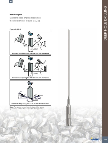 223DEEP HOLE DRILLINGNose AnglesStandard nose angles depend on the drill diameter (Figure 6.5.2.6).Figure 6.5.2.6D0.25xD30%u02da15%u02da30%u02da30%u02da40%u02da 35%u02daStandard sharpening for 0.9 to 4 mm drill diametersD30%u02da12%u02da20%u02da20%u02da30%u02da25%u02da12%u02da 0.3-0.50.25xDStandard sharpening for 4 to 32 mm drill diameters15%u00b0 20%u00b025%u00b0%u00d8Dh5D/4%u00b10,0512%u00b020%u00b00,3/0,512%u00b025%u00b020%u00b0Standard sharpening for 32 to 40 mm drill diametersNote: For special or semi-standard gundrills, special geometries will be offered to match the application.