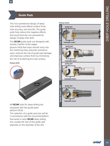 241DEEP HOLE DRILLING%u00bd%u0009Guide PadsThe non-symmetrical design of deep hole drilling tools affects surface finish, hole accuracy, and tool life. The guide pads help reduce the negative effects that result from the non-symmetrical design of deep hole drills. The ISCAR guide pads are designed with double chamfer at the edges (picture 6.8.1) that helps smooth entry into the machining hole, prevents premature wear, reduces the risk of guide pad damage, and improves surface finish by minimizing the risk of scratching the hole surface. Picture 6.8.1All ISCAR tools for deep drilling are equipped with two guide pads (picture 6.8.2). The selection of a guide pad size will be in accordance with the recommendations that exists in each ISCAR deep drilling line, usually the size of the guide pad depends on the diameter of the drill.Picture 6.8.2 ELB System %u2013 Gun Drillindexable insertguide padBTA System - STSindexable insertguide padindexable insertguide padEjector System - DTSindexable insertguide pad