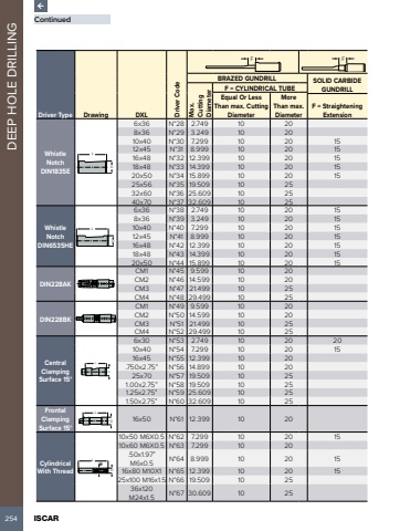 254 ISCAR DEEP HOLE DRILLINGDriver Type Drawing DXL Driver CodeF FBRAZED GUNDRILL SOLID CARBIDE GUNDRILLMax.CuttingDiameterF = CYLINDRICAL TUBEEqual Or LessThan max. CuttingDiameterMoreThan max.DiameterF = StraighteningExtensionWhistle Notch DIN1835ELD6x36 N%u00b028 2.749 10 208x36 N%u00b029 3.249 10 2010x40 N%u00b030 7.299 10 20 1512x45 N%u00b031 8.999 10 20 1516x48 N%u00b032 12.399 10 20 1518x48 N%u00b033 14.399 10 20 1520x50 N%u00b034 15.899 10 20 1525x56 N%u00b035 19.509 10 2532x60 N%u00b036 25.609 10 2540x70 N%u00b037 32.609 10 25Whistle Notch DIN6535HELD6x36 N%u00b038 2.749 10 20 158x36 N%u00b039 3.249 10 20 1510x40 N%u00b040 7.299 10 20 1512x45 N%u00b041 8.999 10 20 1516x48 N%u00b042 12.399 10 20 1518x48 N%u00b043 14.399 10 20 1520x50 N%u00b044 15.899 10 20 15DIN228AKCM1 N%u00b045 9.599 10 20CM2 N%u00b046 14.599 10 20CM3 N%u00b047 21.499 10 25CM4 N%u00b048 29.499 10 25DIN228BKCM1 N%u00b049 9.599 10 20CM2 N%u00b050 14.599 10 20CM3 N%u00b051 21.499 10 25CM4 N%u00b052 29.499 10 25Central Clamping Surface 15%u00b0LD6x30 N%u00b053 2.749 10 20 2010x40 N%u00b054 7.299 10 20 1516x45 N%u00b055 12.399 10 20.750x2.75%u201d N%u00b056 14.899 10 2025x70 N%u00b057 19.509 10 251.00x2.75%u201d N%u00b058 19.509 10 251.25x2.75%u201d N%u00b059 25.609 10 251.50x2.75%u201d N%u00b060 32.609 10 25Frontal Clamping Surface 15%u00b0LD 16x50 N%u00b061 12.399 10 20CylindricalWith ThreadL MD10x50 M6X0.5 N%u00b062 7.299 10 20 1510x60 M6X0.5 N%u00b063 7.299 10 20.50x1.97%u201dM6x0.5 N%u00b064 8.999 10 20 1516x80 M10X1 N%u00b065 12.399 10 20 1525x100 M16x1.5 N%u00b066 19.509 10 2536x120 M24x1.5 N%u00b067 30.609 10 25Continued
