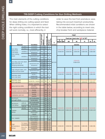 268 ISCAR DEEP HOLE DRILLINGTRI-DEEP Cutting Conditions for Gun Drilling MethodsThe main elements of the cutting conditions for deep drilling are cutting speed and feed. When drilling holes, it is important to select the right cutting conditions in which the tool will work normally, i.e., most efficiently, in order to save the tool from premature wear, taking into account maximum productivity. Recommended initial conditions are shown in the table below, according to insert size, chip breaker form and workpiece material.ISOMaterial Condition Tensile Strength [N/mm2] Hardness HB Material Group No. TOGTVm/minFeed per insert size \06 07 08 09 10 11 12 13mm/revPnon-alloy steel and cast steel, free cutting steel<0.25% C annealed 420 125 180-1200.04-0.08 0.08-0.140.04-0.10 0.08-0.160.06-0.10 0.08-0.160.06-0.10 0.08-0.160.06-0.12 0.08-0.18%u22650.25% C annealed 650 190 2<0.55% C quenched and tempered 850 250 3%u22650.55% Cannealed 750 220 4quenched and tempered 1000 300 50.04-0.12 0.06-0.20 low alloy and cast steel (less than 5% of alloying elements)annealed 600 200 6quenched and tempered930 275 71000 300 81200 350 9high alloyed steel, cast steel and tool steelannealed 680 200 100.04-0.08 0.08-0.140.04-0.10 0.08-0.160.06-0.10 0.08-0.160.06-0.10 0.08-0.160.06-0.12 0.08-0.18quenched and tempered 1100 325 11stainless steel and cast steelferritic / martensitic 680 200 12martensitic 820 240 13M stainless steel and cast steel austenitic, duplex 600 180 14 50-100 0.02-0.06 0.04-0.120.02-0.06 0.04-0.120.02-0.06 0.04-0.120.02-0.06 0.04-0.120.02-0.06 0.04-0.12Kgray cast iron (GG) ferritic / pearlitic 180 1550-100 80-1200.03-0.15 0.08-0.250.03-0.15 0.08-0.250.05-0.18 0.08-0.250.05-0.18 0.08-0.300.05-0.18 0.08-0.30pearlitic / martensitic 260 16nodular cast iron (GGG) ferritic 160 17pearlitic 250 18malleable cast ironferritic 130 19pearlitic 230 20Naluminumwrought alloysnot hardenable 60 2180-160 0.03-0.15 0.08-0.200.03-0.15 0.08-0.200.03-0.18 0.08-0.200.05-0.18 0.08-0.200.03-0.18 0.08-0.20hardenable 100 22aluminumcast alloys%u226412% Sinot hardenable 75 23hardenable 90 24>12% Si high temperature 130 25copper alloys>1% Pb free cutting 110 26brass 90 27electrolytic copper100 28non metallicduroplastics, fiber plastics 29hard rubber 30Shigh temperature alloysFe basedannealed 200 3120-50 0.08-0.14 0.08-0.16 0.08-0.16 0.08-0.16 0.08-0.16hardened 280 32Ni or Co basedannealed 250 33hardened 350 34cast 320 35