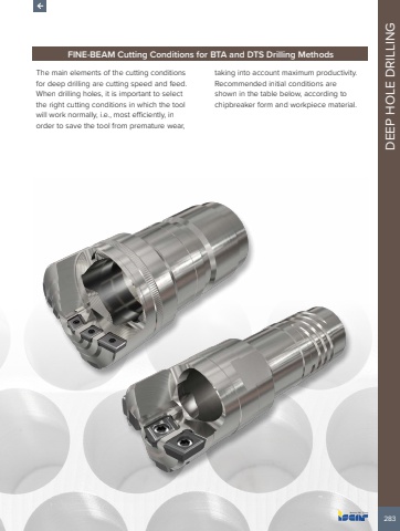 283DEEP HOLE DRILLINGFINE-BEAM Cutting Conditions for BTA and DTS Drilling MethodsThe main elements of the cutting conditions for deep drilling are cutting speed and feed. When drilling holes, it is important to select the right cutting conditions in which the tool will work normally, i.e., most efficiently, in order to save the tool from premature wear, taking into account maximum productivity. Recommended initial conditions are shown in the table below, according to chipbreaker form and workpiece material.