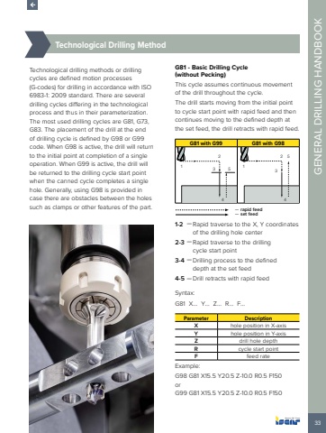 33GENERAL DRILLING HANDBOOK%u00bd%u0009Technological Drilling MethodTechnological drilling methods or drilling cycles are defined motion processes (G-codes) for drilling in accordance with ISO 6983-1: 2009 standard. There are several drilling cycles differing in the technological process and thus in their parameterization. The most used drilling cycles are G81, G73, G83. The placement of the drill at the end of drilling cycle is defined by G98 or G99 code. When G98 is active, the drill will return to the initial point at completion of a single operation. When G99 is active, the drill will be returned to the drilling cycle start point when the canned cycle completes a single hole. Generally, using G98 is provided in case there are obstacles between the holes such as clamps or other features of the part.G81 - Basic Drilling Cycle (without Pecking)This cycle assumes continuous movement of the drill throughout the cycle.The drill starts moving from the initial point to cycle start point with rapid feed and then continues moving to the defined depth at the set feed, the drill retracts with rapid feed.G81 with G99 G81 with G9812345 12 534%u2014 rapid feed %u2014 set feed1-2 %u2014Rapid traverse to the X, Y coordinates of the drilling hole center2-3 %u2014Rapid traverse to the drilling cycle start point3-4 %u2014Drilling process to the defined depth at the set feed4-5 %u2014Drill retracts with rapid feedSyntax: G81 X%u2026 Y%u2026 Z%u2026 R%u2026 F%u2026Parameter DescriptionX hole position in X-axisY hole position in Y-axisZ drill hole depthR cycle start pointF feed rateExample:G98 G81 X15.5 Y20.5 Z-10.0 R0.5 F150orG99 G81 X15.5 Y20.5 Z-10.0 R0.5 F150
