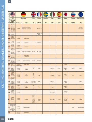 350 ISCAR CUTTING MATERIAL GRADES AND ENGINEERING MATERIALS Material Group No.USA Germany U.K. France Sweden Italy Spain Japan Russia EURONORMAISI/SAE/UNS/ASTM/AA Werkstoff DIN BS AFNOR SS UNI UNE JIS GOST EN34Waspaloy;N07001;AISI 685;AMS 5704;AMS 5706;AMS 5708;AMS 55442.4654 NiCr20Co13Mo4Ti3AL;NiCr 19 Co 14 Mo 4 Ti NC 20 K 14 NiCr20Co 13Mo4Ti3AL34 Rene 80 NC14 K9 T5 DWA355388C;N30002;CW-12MW; 2.4883 G-NiM16CrW35N7M;N-7M;N300072.4685 G-NiMo28 ND 30 M35N12MV;N-12MV;N300122.4882;9.4810;2.4810/9.4810G-NiMo3035Nimocast PK24;N13100;AMS 53972.4674 G-NiCo15Cr10AlTiMo HC 204 NK 15 CAT35Jethete M-252;N07252;AMS 55512.4916 G-NiCr19Co;G-NICR 19 Co35Nimocast 713;N07713;AMS 5391;Inconel 713LC2.4670 G-NiCr13Al6MoNb HC 203 NC 13 AD35 M-35-1;N2141352.4365;2.4365/9.4365 G-NiCu40Nb NiCuC36Titanium Grade 1;R50250;ASTM GR. 13.7024;3.7025Ti 1;Ti 99.8 TA1 T-35 Ti1-Type 1 Ti-PO1 Class 2;Gr-1 VT1-00 Ti 99.836Titanium Grade 2;R50400;AMS 4902;AMS 4941;AST M Gr. 23.7034;3.7035;3.7036Ti 2;Ti 99.7TA2;TA3;TA4;TA5T-40 Ti1-Type 2 Ti-PO2 Class 2;Gr-2 VT1-0 Ti 99.736Titanium Grade 3;R50500;ASTM Gr. 33.7055;3.7056Ti 3;Ti 99.6DTD 5023, DTD 5273 T-50 Ti1-Type 3 Class 3;Gr-3 Ti 99.636Titanium Grade 4;R50700;ASTM Gr. 43.7064;3.7065;3.7066Ti 4;Ti 99.5TA7;TA8;TA9T-60 Ti1-Type 4 Class 4;Gr-4 Ti 99.536Titanium Grade 7;R52400;Ti-0.15Pd3.7235 Ti2Pd-Type 7 Class 13;Gr-1337Titanium Grade 5;R56400;Ti-6Al-4V3.7165;3.7164 Ti6Al4VTA10;TA11;TA12;TA13;TA 28;TA56;Ti-Al-VTA6V;T-A 6 V;Ti-P.63TiAl6V4-Type 5 Ti-P63Class 6 0;Gr 6 0;SAT-64VT6 Ti6Al4V37Titanium Grade 6Al-2Sn-4Zr2Mo;R54620;6Al-2Sn-4Zr2Mo3.7145;3.7144 TiAl6Sn2Zr4Mo2 VT25 TiAl6Sn2Zr4Mo237 3.7175;3.7174 TiAl6V6Sn2