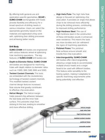 61GENERAL PURPOSE DRILLINGBy offering both general-use and application-specific geometries, ISCAR%u2019s SUMO-CHAM exchangeable drill heads provide flexibility and efficiency for a broad spectrum of drilling needs in various industries. Users can select the appropriate geometry based on the materials and applications they work with, optimizing their drilling processes and achieving better results.Drill BodySUMO-CHAM drill bodies are engineered with various features aimed at optimizing hole machining operations. The key features of SUMO-CHAM drill bodies are:%u2022 Depth-to-Diameter Ratios: SUMO-CHAMdrill bodies are designed for machining holes with depth relation to diameter ratios such as: 1.5XD, 3XD, 5XD, 8XD and 12XD.%u2022 Twisted Coolant Channels: The tools are embedded with the revolutionary technology of twisted coolant channels. This modified twisted coolant channel design features increased flute volume that greatly contributes to effective chip evacuation.%u2022 Helical Margin: The helical margin helps prevent chip adhesion between the tool body and the inner hole surface. This prevents chips from sticking to the tool, leading to smoother and more effective drilling.%u2022 High Helix Flute: The high helix flute design is focused on optimizing chip evacuation. It provides an angle that allows chips to be removed more efficiently during the drilling process, contributing to improved drilling performance.%u2022 High Hardness Steel: The use of high-hardness steel in the construction of these drill bodies results in enhanced wear resistance. This means the tools are more durable and can withstand the rigors of machining operations.%u2022 Polished Flutes: The polished flute surfaces ensure smooth and trouble-free chip evacuation.%u2022 Interchangeability: SUMO-CHAMdrill bodies offer interchangeability, allowing a single body to accommodate multiple-choice heads and a single head to be used with different bodies. This feature adds versatility to the tooling system, making it adaptable to specific machining requirements while being potentially cost-effective.helical marginhigh helix flutehigh hardness steeltwisted coolant nozzlespolished flutesaccurate pocketcoolant directed to the cutting area