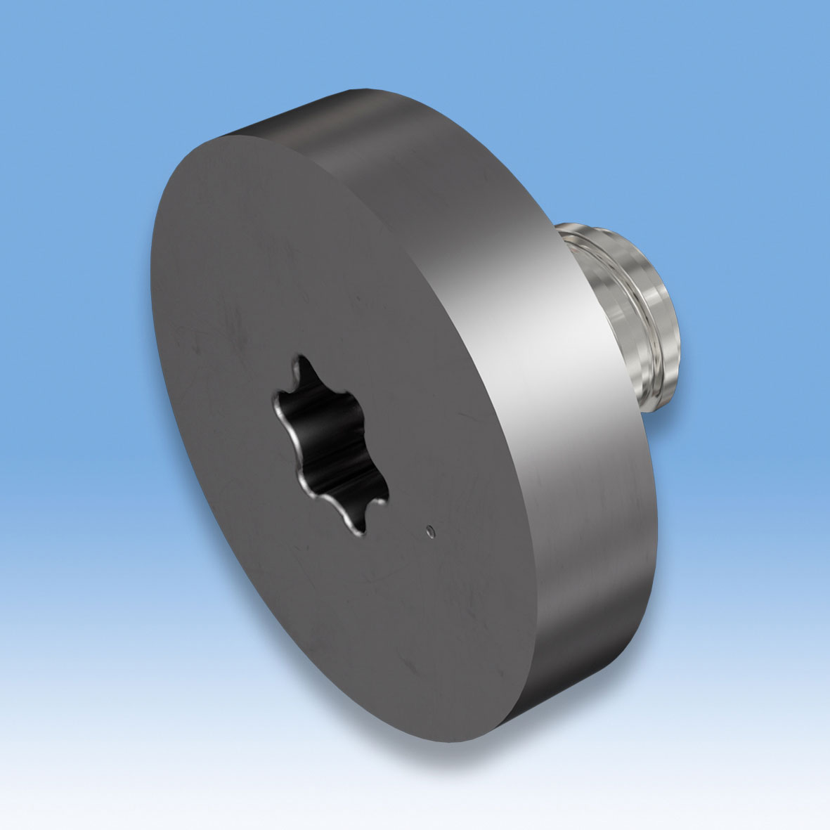 The MULTI-MASTER family offers extra-long shanks with an inner MULTI-MASTER thread on the front face and a center hole on the back face, which can be cut and shaped by the customer. Recently, ISCAR introduced uncoated carbide blank heads with two sections: a disc-form front area with a hexalobular (TORX) recess on the face, and a rear area with an outer MULTI-MASTER thread (Fig. 3). These heads are intended for producing special items to be mounted on MULTI-MASTER shanks at the customer's machine shops for different machining operations such as milling slots, grooves, threads, splines, gears, and more.