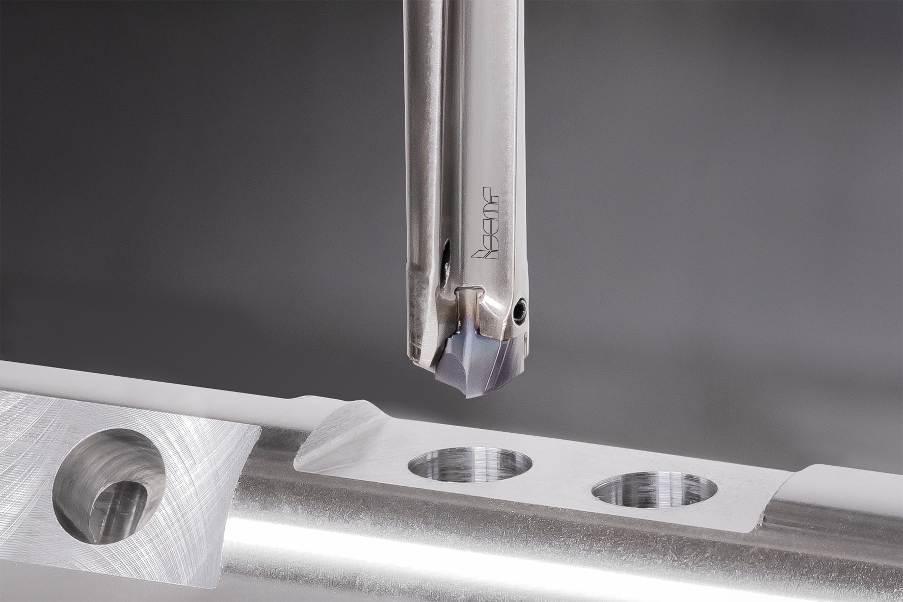 In addition, the development of the line can be seen in various directions. One of them is QUICKDRILL – a family of drills with exchangeable carbide heads designed primarily for machining under challenging conditions, such as entering or exiting slanted surfaces, drilling through cross holes etc. Each drill in this family features a robust head securing mechanism that incorporates the SUMOCHAM self-clamping principle and a side lock screw (Fig. 1). The drill body is made from high-grade steel and includes a specially shaped flute to optimize the strength characteristics of the body's cross-section. Dual nozzles deliver a large volume of coolant directly to the cutting zone, maintaining uninterrupted coolant flow. Additionally, the head's specially designed geometry significantly enhances the drill's ability to withstand unfavorable machining conditions. Moreover, the nearly straight and polished flute facilitates the use of the drill on lathes as a stationary tool, allowing for smooth chip evacuation.